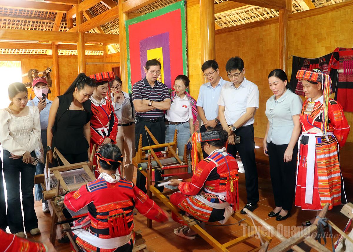 | Đoàn trải nghiệm nghề dệt vải của dân tộc Pà Thẻn, xã Tân Trịnh. |