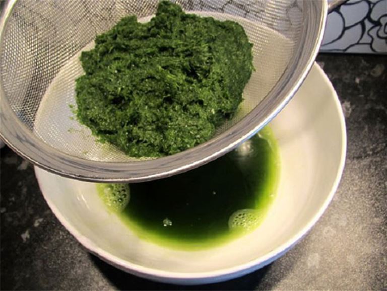 Tiếp đến, đem lá gừng đi rửa sạch, cắt nhỏ rồi giã lấy phần nước có màu xanh lá. Dùng rây lọc qua lọc lại nhiều lần để lấy sạch nước và loại bỏ hoàn toàn phần bã của lá. Pha phần nước màu với nước rồi đổ gạo nếp cái hoa vàng vào ngâm trong khoảng 10 tiếng đồng hồ. Sau đó, vớt gạo ra để ráo.