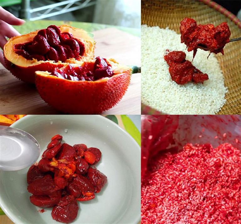 Màu đỏ của xôi ngũ sắc Hà Giang sẽ dùng gấc để nhuộm. Công đoạn này thì cần phải ngâm gạo trước trong khoảng 6 – 7 tiếng. Trong thời gian chờ đợi, đem gấc đi sơ chế. Gấc đem bổ đôi, vét lấy phần ruột gấc cho vào bát. Chuẩn bị một chén rượu trắng, một chút muối trộn đều cùng ruột gấc. Bóp kỹ đến khi phần thịt gấc tách ra khỏi hạt. Sau khi ngâm gạo thì trộn gấc và gạo với nhau cho đều màu.