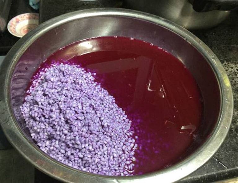 Chia số gạo đã chuẩn bị thành 5 phần bằng nhau. Để ra được màu tím, người ta sẽ rửa sạch lá cẩm sau đó thả vào nồi nước sôi. Phần nước luộc nên pha với chút muối để gạo thêm đậm đà. Luộc kỹ lá cẩm để nó tiết ra hết ra chất có màu tím. Sau đó, vớt lá cẩm ra và cho gạo vào ngâm trong khoảng 10 tiếng. Sau khi ngâm không cần xả lại nước nữa.
